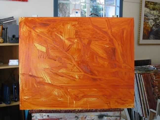 The second step is to underpaint the canvas. Here I used "burnt sienna and a large house brush. The idea is to simply cover the canvas in a "painterly" manner without any regard for the subject!