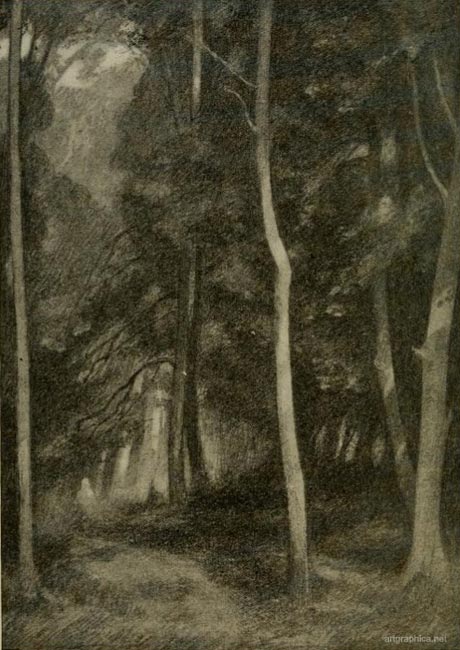 ...arm or the precisely tubular form of some twigs, we acknowledge the occurrence as something outside the general rule, and accentuate it in our drawing. The flat spaces constructing other circular forms give to them just that strength and variety that prevents their relapsing into flaccidity. Under the simple light of a grey sky the foliage of a tree can be considered and studied as the planes that construct a great dome; a simple statement of each tone that represents each different plane will give fulness and solidity, and some variety. If we take as a