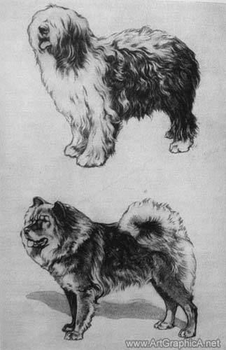 Both the Poodle (Plate xxii) and the Sheep dog (Plate xix) are the exceptions to the general rule as to hair arrangement. In these two dogs the hair has been artificially developed to such an extent that it completely hides the form of the body beneath, and the equal density of growth showing but little change in direction has given them something of the lack of character seen in the sheep. In cases such as this, it is upon shadow masses only that the artist is forced to rely.