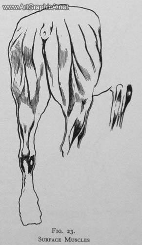 Their action is to adduct the thigh and flex the stifle joint. The Sartorius is a muscle upon the inside of the thigh and is visible in jumping or rearing positions (Fig. 24).