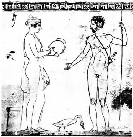 Fig 46. -- A brush drawing from a white Athenian vase (cylindrical). Though there are puzzling details such as the smallness of the man's hands, the parallelism of his feet, etc., yet the purity of line and the suggestion of form should he closely studied. [British Museum].