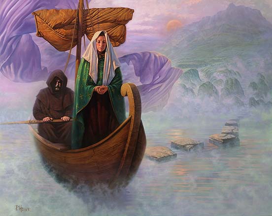 This shot of my palette at this stage shows the freely mixed warm and cool tones (purple and blue with warm green and red earth hues loosely mixed with Liquin medium). The resulting 'grays' aren't flat and dead looking but have color and life. So when I coated this over the underpainted richer coloring of the blocked in sea, this helped to tone it down and give more of an effect of real fog rather than an airbrushed, too smooth mist, which says nothing. I tried to stick with my same two main larger brushes, the 1" flat sable or synthetic, and a 1-2" full, bristle filbert, then buffed the rough block-in of fog with a full mop brush and fans. An additional greenish gray layer went over this stage, not shown here, to further unify and soften the fog like atmosphere would in a sky distance. I could have kept going I suppose, layer upon layer, each done quickly but having to wait for the paint to thoroughly dry in between layers. In fact, you can paint a lot of atmospheric or solid effects this way- one the base, 2nd layer the shadow, 3rd- the fading or similar effect, and on and on. It takes a bit of planning and helps to know if you don't get what you want you can always paint over it with heavy paint , or sand it off, then start over. It takes some patience so don't get frustrated with no immediate results, the effects can be worth it.