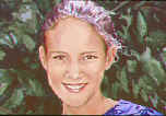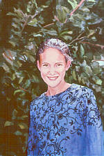 After completing the background and touching up areas in Alyssa's face and hair, I proceed to the design in Alyssa's very cool blue top. The dark navy blue is created by mixing a touch of cadmium red to ultramarine blue.