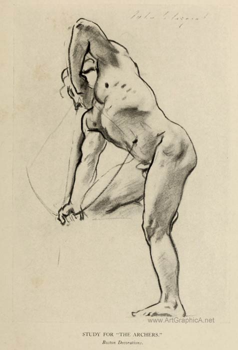 It forms a spacious landing and encloses the head of the marble staircase. Abbey, at the same time, undertook the decoration of the distributing room, involving a frieze of 180 feet in length and 8 feet in height. His first intention was that the frieze should have for its theme "subjects taken either altogether from Shakespeare, or one each from some typical writer of the various countries of Europe." Later this was altered to a single subject, "The quest and achievement of the Holy Grail," divided into fifteen scenes. It will be noticed that as late as May, Sargent was still thinking of getting his subjects from Spanish literature. Why then did he turn from a theme with which he was already familiar, and launch upon a subject so vast and complex as that he ultimately chose ? It may well be that in the symbolic figures of an abstract theme he saw and welcomed an escape from the concrete, and from the literalness and limitations of portraiture. Decoration was a phase of art in which he had himself made no experiments. It is true that he had studied Tintoretto and Tiepolo and the great Venetian decorators, and had been a pupil of Carolus Duran when that artist had painted a ceiling for the Louvre, but he had done nothing of the sort himself. Confronted now with the alternative of taking scenes from the pictorial literature of Spain, or choosing some scheme of his own, he turned to religion. The subject required faculties and qualities not usually associated with Sargent's art. For once he was not dealing with the visible and tangible world, but rather a thing so abstract as a movement of thought. The progress of that movement had to be interpreted, symbolized and legibly translated into painted form. It was a daring scheme. He must have seen in a flash of intellectual vision the possibilities of the idea. His mind must have been already stored with learning sufficient, at any rate, to enable him to visualize vaguely the opportunities or imagery provided by such a theme. But it was with no fervour of religious enthusiasm that he approached it. To Sargent the evolution of religion was a subject which could be viewed with detachment; he approached it without bias or preference. He was no mystic drawing near to some sacred shrine, no devout enthusiast working by the light of an inward revelation, but a painter aware that here was a subject with a significance lending itself to interpretation in decorative pictorial designs. His imagination was fired, but as when he was told he had revealed the moral qualities of a sitter he said, "No, I do not judge, I only chronicle," so in his Boston decorations he must be understood as treating objectively and dispassionately the images suggested by his theme.*