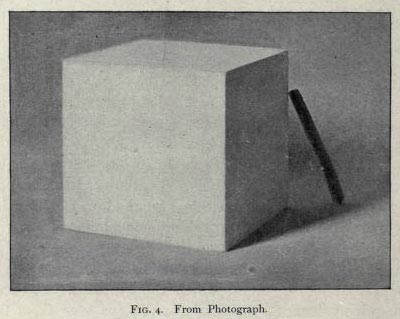 Fig. 4 represents a white cube placed against a gray background and a piece of charcoal resting against the cube. The light comes from above, behind, and at the left of the spectator.