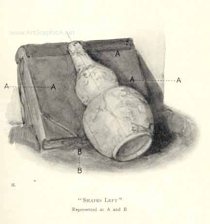 Then note down the shape B contained within the lower edge of the book and the lower left side of the vase, and the mass of the cast shadow on the lower right side. This will remove the initial difficulties.
