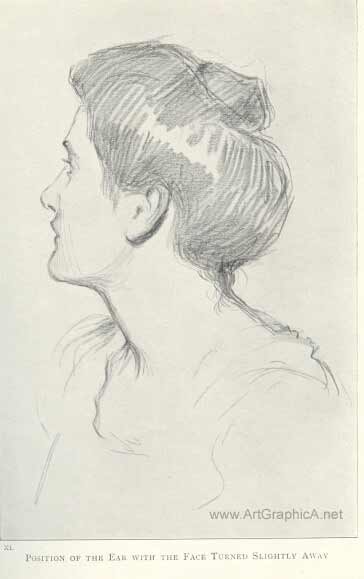 When the face is lowered, as in Plate IX., the space between the brow and the eye is shortened, [45] the tip of the nose is nearer the mouth, and the chin cuts well into the neck ; and as the ear is raised, the back line of the neck is thereby lengthened. The brows and mouth, overlaying somewhat convex surfaces, curve upwards, and a greater mass of hair is seen above the face.