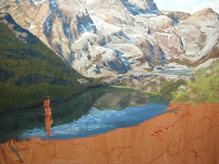39.>As I begin to paint the reflections in the water, I must keep mindful of several things. First, the viewer's eye is pretty high in this composition and as such will see a steep reflection in the water meaning that from this perspective one wouldn't see the entire mountain reflected, only a very small portion of the nearest ridge as the mountian recedes fairly rapidly even though it's so incredibly steep...Secondly, I have to be careful with my values, lights will be darker than the areas they reflect, and darks will be lighter than the areas they reflect in general. the closer an object to its reflection, the more closely in value that reflection will be to the object's values...I know, that's a lot to wrap your mind around...let's move on...