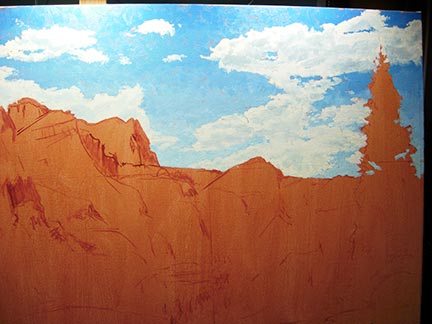 15. Once I'm satisfied with the sky, I move on to the main focal point of the painting, the buttes. I start by thinly laying-in the dark area of the mountains. In this photo, the darks look quite dark, but in actuality, the dark areas aren't super dark. I want these mountains to recede a bit and as such I must be careful not to go too dark in the shadows in this part of the painting.