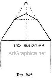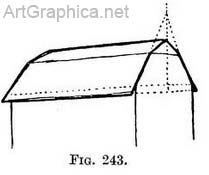 Practice for Fig. 244. — Find by diagonals the centre of the building, either on the ground or on the top of the walls, whichever suits you best. Raise a vertical from the centre, copy the inclination of one side of the roof till it meets the vertical line. Make the other lines of the roof meet this vertical at the same point.