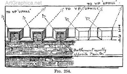 Battlements. — The character of the parapet or battlement may call up some exercise of craft, in particular when the battlement has a capping or moulding continuous with its outline. The spacing of a certain number of battlements with their intervals will be gauged by one of the methods explained in Chap. III. This will be worked out on the face of the wall, and then receding lines will be taken at each interval through the thickness of the wall (or up the slope of the cap moulding) to determine the back line of the battlements. In this way the upright width of each interval will be obtained (Figs. 254 and 255).