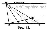(B) Depths found by a scale on the base-line. — If (Fig. 63) we saw a line (I-II) full-face, it being divided into equal proportions, and we carried receding lines from both ends (I-II) and from each division to a V.P. on the horizon; then a foreshortened line (I-III) would also be divided into similar proportions in perspective ; each division getting regularly shorter from the nearest to the farthest end of the line.
