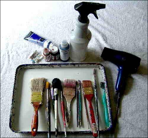 I use a combination of synthetic and sable watercolor brushes. My prized 3" red sable finally bit the dust, so I am down to a 2" white sable which is now my favorite. For the technique in this painting, I won't have the opportunity to use the large flat brushes; I'll being using rounds exclusively. I prefer a large metal butcher's tray as a palette. The only other things I use are a spray bottle, hair dryer, and a toothbrush for applying fine spatter.