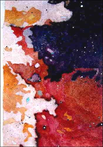 With the spray bottle, I disperse the color in some places, and blot it out in others. When it dries, you end up with a more together-looking picture. Bright color is softened over here, and pops through over there. Adds depth, and gives the surface an undulating, alive look that puts the subject inside the picture. Then I loaded a brush with gold metallic pigment, dunked it in a bucket of water to make about a 1,000,000:1 mixture, to do another light wash. I'm careful not to use too much of the metallic, because it reflects light, and can obscure, rather than embellish. I try to get it so you just see the occasional random spark. Very hard to get a photo of that.